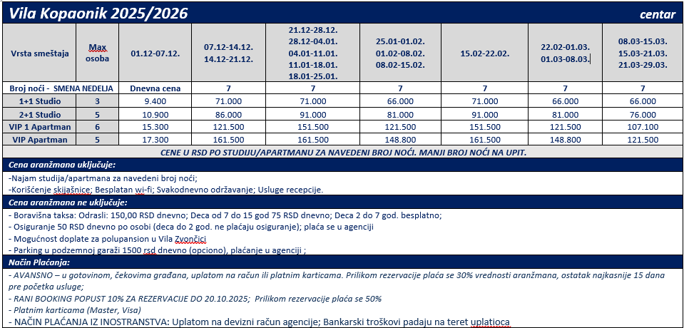 Cenovnik Zima 2025/2026